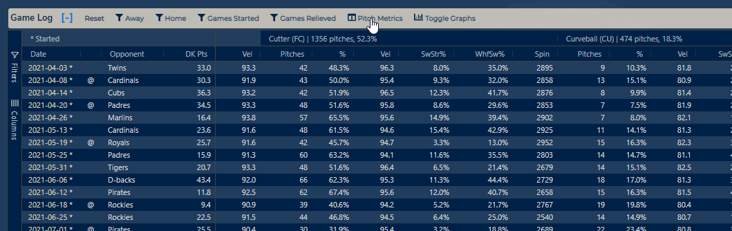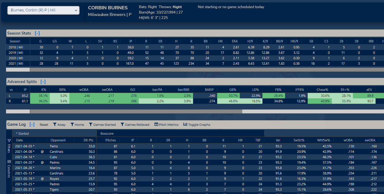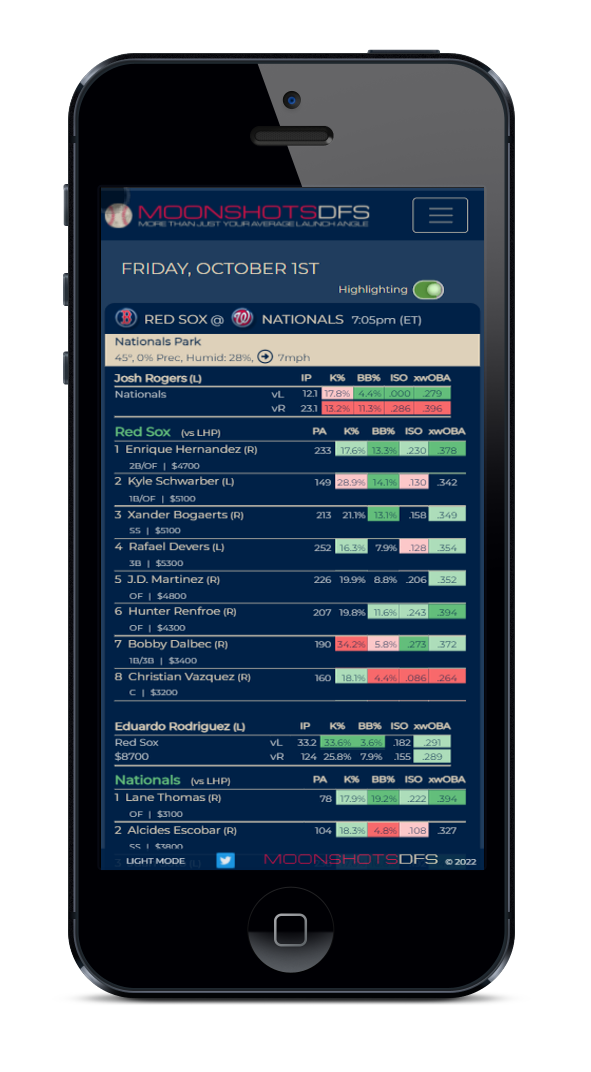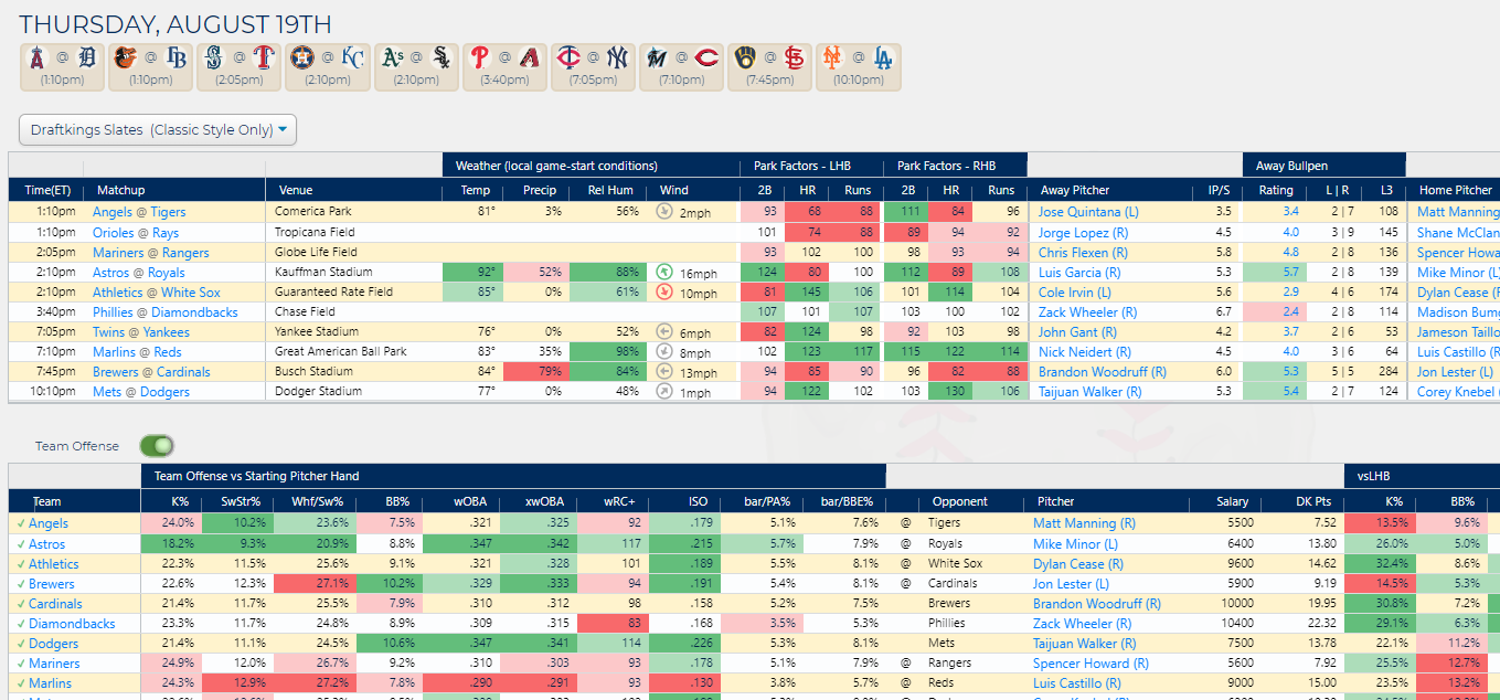 Proprietary projections are run each morning with the probable pitchers and projected lineups. As each lineup is confirmed, the game is again simulated a preset number of times. Projections include obvious data points such as lefty/right splits, ballpark factors, and weather. Our projections include a number of other factors along with dynamic weightings.