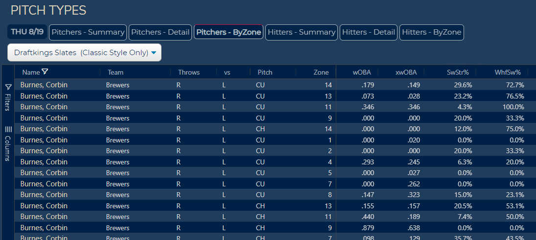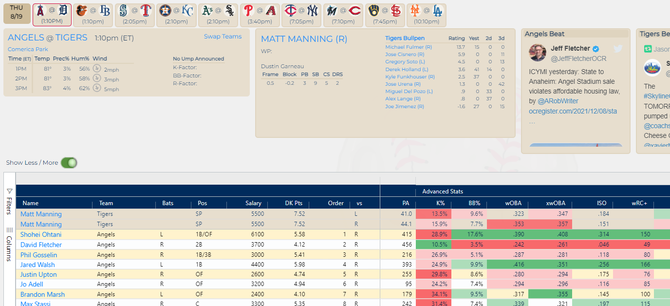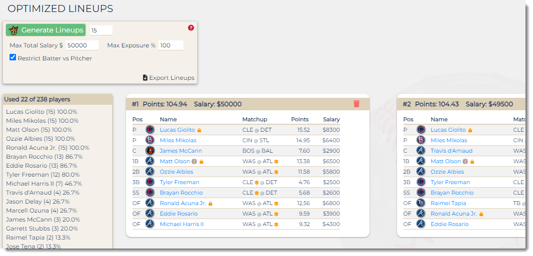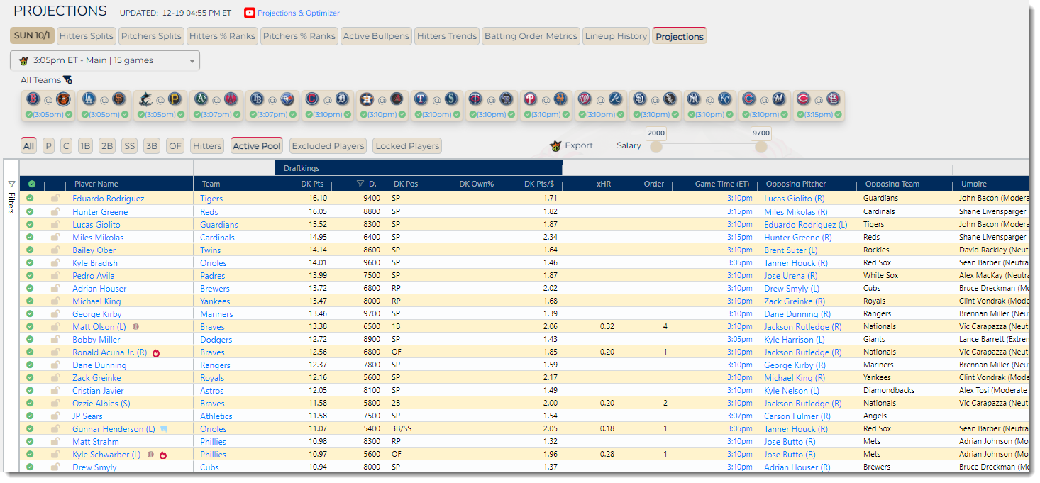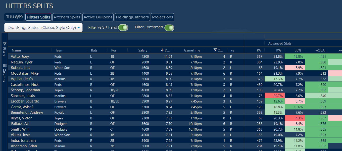 - Filters for pitchers/hitters, position, salary, batting order, etc.